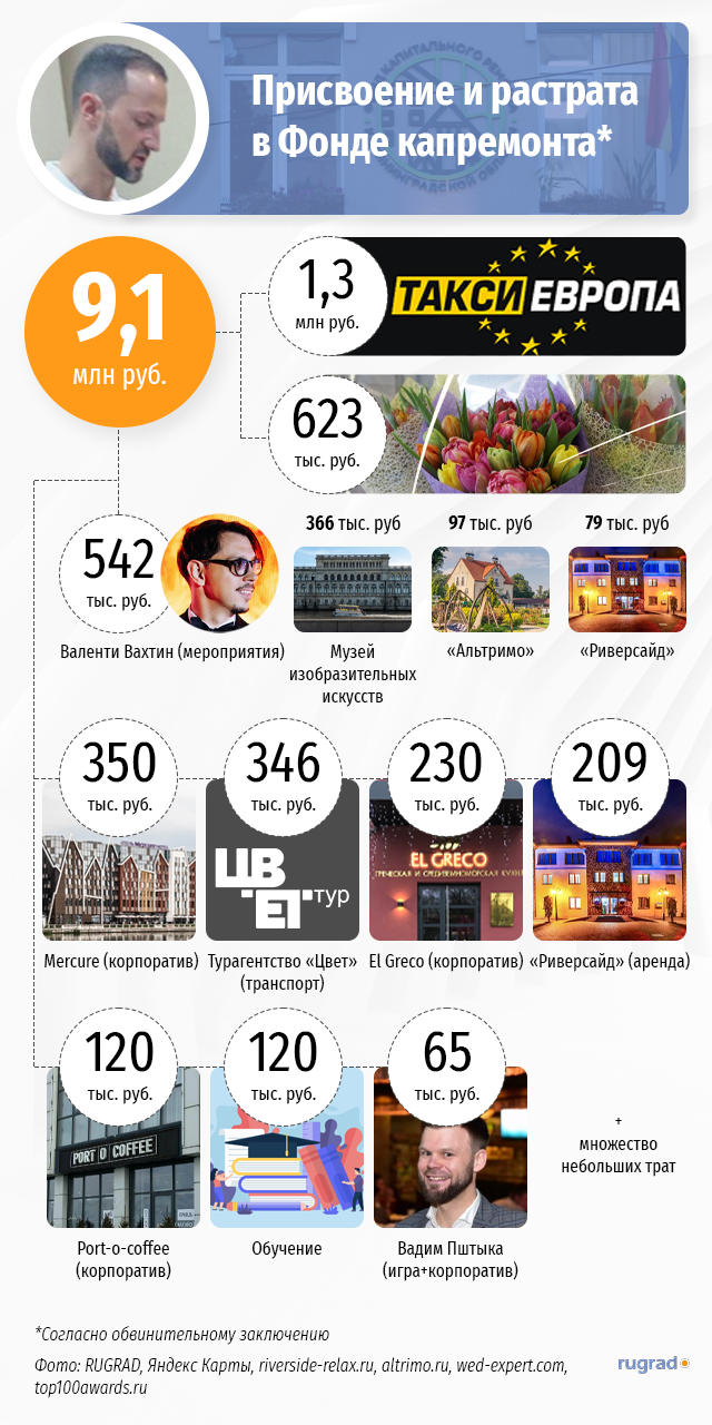 В 2020 году Вахтин организовывал для фонда мероприятие в комплексе «Альтримо» в Рыбачьем на Куршской косе. Тогда его услуги были оценены в 97 тыс. руб. В обвинительном заключении подчеркивается, что мероприятие носило развлекательный характер и не было связано с деятельностью ФКР.