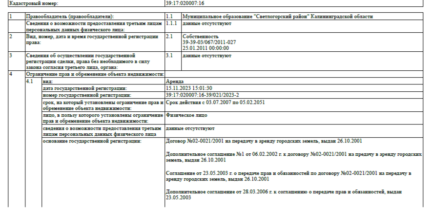 По информации из Росреестра, участок 39:17:020007:16 с 2001 года начал сдаваться в долгосрочную аренду. Договор на аренду муниципальной земли действует как минимум до 5 февраля 2051 года. Право аренды приморской земли несколько раз переуступалось. Последний раз изменения касательно пользователя вносились в ЕГРН 15 ноября 2023 года. На тот момент вид разрешенного использования участка не имел прямого отношения к строительству конкретно гостиницы и был обозначен довольно широко, а именно «строительство нежилых объектов — пансионаты, санатории, дома отдыха, гостевые дома и другие объекты». Кадастровая стоимость земли составляла 4,6 млн руб.