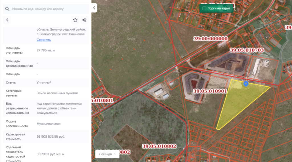 Разрешение на 5-этажную застройку соседнего участка 39:05:010901:442 площадью 3 га «СЗ «Трампхаус» получил еще в августе 2021 года. На тот момент его площадь достигала 4,6 га. В августе 2025 года от него был отмежеван участок 39:05:010901:1451 площадью 1,62 га под уже построенную очередь ЖК «Кранц-Сити».
