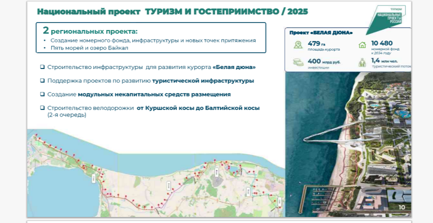 Туристический кластер «Белая дюна» в Калининградской области стал самым дорогим инвестиционным проектом среди субъектов РФ после проектируемого курорта «Новая Анапа» в Краснодарском крае. Стоимость строительства «Белой дюны» на более чем 10 тыс. номеров оценивается в 440 млрд руб.