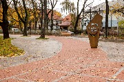 Ржавая стела из кортена с каштановым листом из нескольких тонких листов металла производит странное впечатление. Такие же малые архитектурные формы из кортена как дань моде установлены на острове Канта. Возле стелы гораздо более уместнее смотрелась был круглая площадка с уложенной по кругу плиткой как центр пространства, а не простые квадратики. Расчищенное от деревьев место теперь напоминает место для остановочного павильона трамвая, но его тут уже не будет. Вероятно, здесь планируется автобусная остановка.