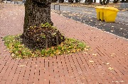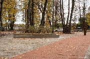 Местами на новой плитке в Каштановом парке после дождливой осени появились зеленоватые следы сырости. Одна из двух скамеек установлена на обычную бетонную форму, которая со временем будет крошиться от дождя. Такой прием благоустройства выглядит откровенно дешево, поскольку деревянный материал скамейки уже чернеет от влаги.