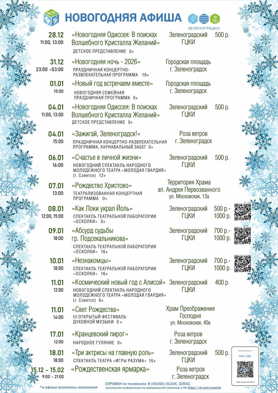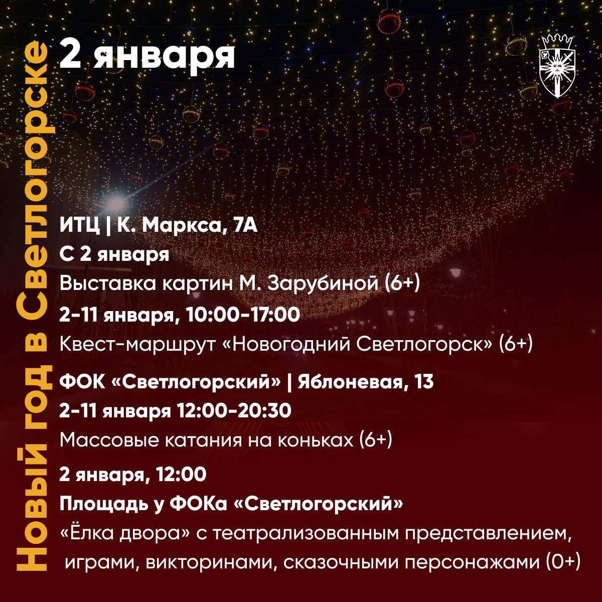 В Светлогорске можно совместить квест-маршрут «Новогодний Светлогорск», массово покатать на коньках у ФОКа и поучаствовать в «Елке двора». Последние парады Дедов Морозов и Снегурочек можно будет попробовать успеть увидеть в Зеленоградске.