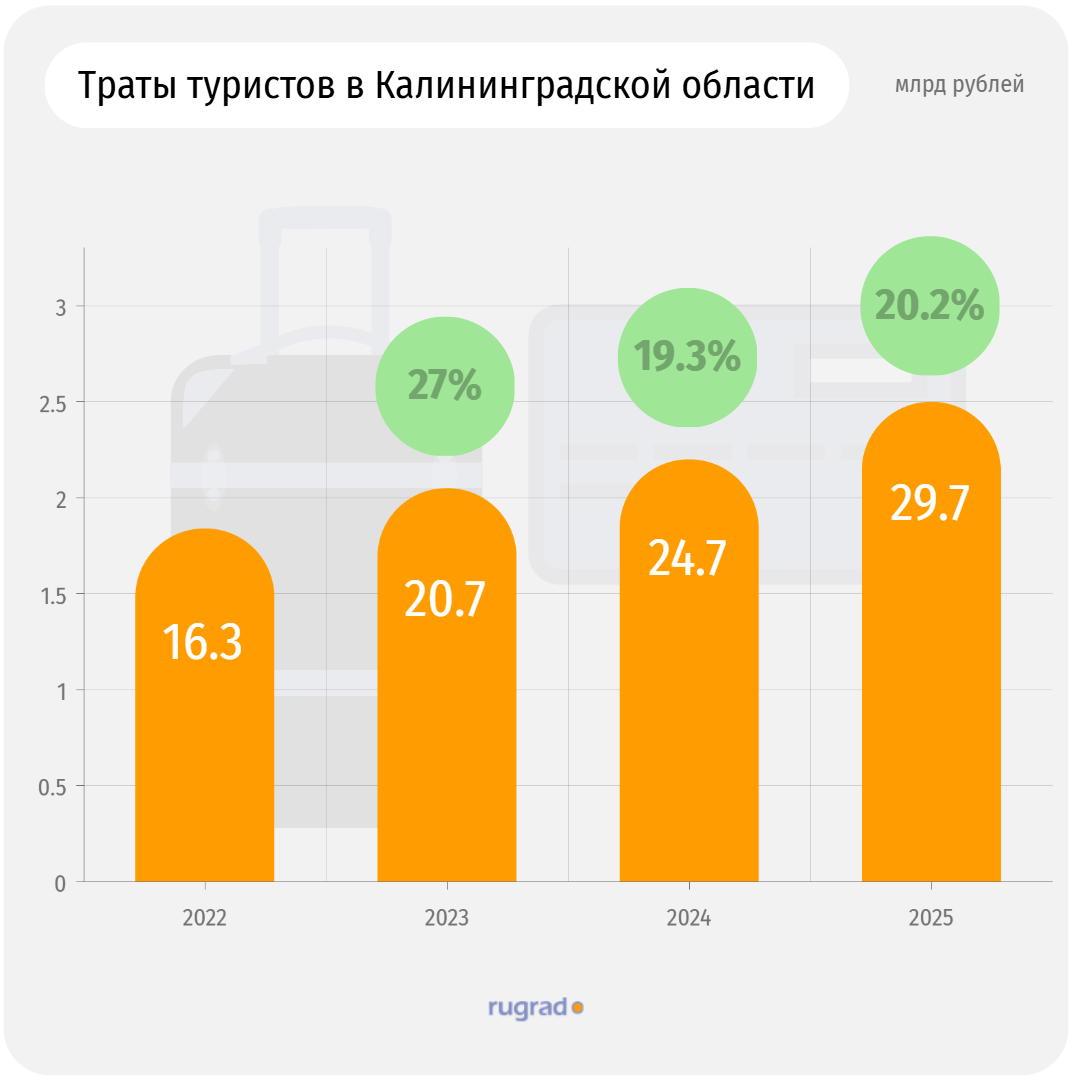 По данным «Сбераналитики», расходы туристов в Калининградской области демонстрируют устойчивый рост. В 2022 году траты составили 16,3 млрд руб., в 2024 году достигли уже 24,7 млрд руб. В 2025 году туристы потратили 29,7 млрд руб. Это на 21 % больше, чем годом ранее, при том что официальный показатель инфляции в регионе в прошлом году составил 8 %.