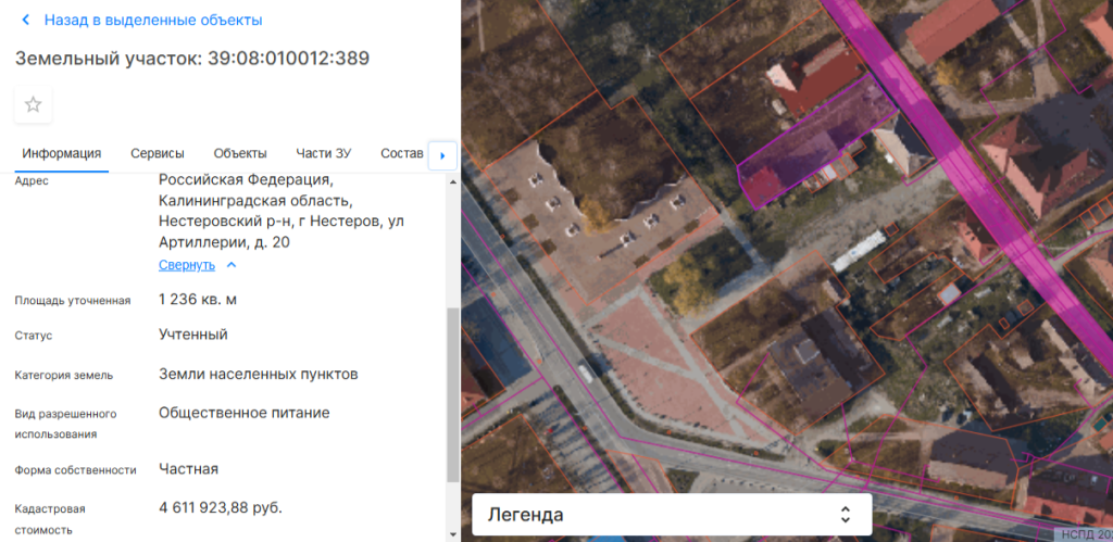 По данным ЕГРН, заброшенные строения располагаются прямо в центре Нестерова на участке с кадастровым номером 39:08:010012:389 площадью 1,2 тыс. кв. м. Земля предназначается под общепит. С юго-восточной стороны к одному из зданий пристроены гаражи. На соседнем участке под развлекательные мероприятия 39:08:010012:379 находится еще одно неиспользуемое здание.