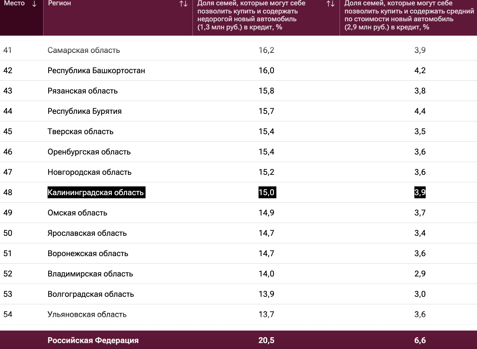 Годом ранее автомобиль стоимостью 1,2 млн руб. могли приобрести 11,8 % калининградских семей, 2,9 млн руб. — 3,3 % (17,6 % и 5,7 % в среднем по РФ).