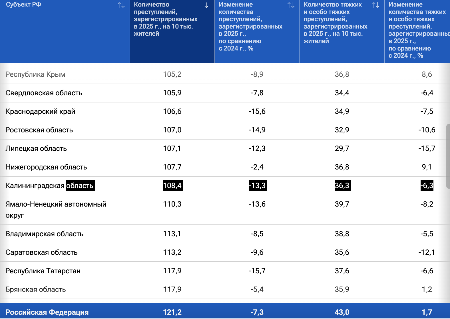 {"ID":"1308338","~ID":"1308338","TAGS":"преступность, регионы, тяжкие преступления, калининградская область. рейтинг","~TAGS":"преступность, регионы, тяжкие преступления, калининградская область. рейтинг","NAME":"Количество тяжких преступлений в регионе снизилось на 6 %","~NAME":"Количество тяжких преступлений в регионе снизилось на 6 %","IBLOCK_ID":"54","~IBLOCK_ID":"54","IBLOCK_SECTION_ID":"4068","~IBLOCK_SECTION_ID":"4068","DETAIL_TEXT":"\u003Cp\u003E\r\n\t Калининградская область заняла 34\u0026nbsp;место в рейтинге регионов РФ по преступности, соответствующие данные приводит РИА Рейтинг. Годом ранее регион занимал также 34 место.\u003Cbr\u003E\r\n \u003Cbr\u003E\r\n\t В 2025 году\u0026nbsp;в регионе было зарегистрировано 108,4 преступления\u0026nbsp;на 10 тыс. жителей, по сравнению с прошлым годом снижение показателя составило 13,3 %. Что касается тяжких и особо тяжких преступлений, в прошлом году в регионе было зарегистрировано 38,7 таких преступлений на 10 тыс. человек (-6,3 %).\u0026nbsp;\r\n\u003C\/p\u003E\r\n\u003Cp\u003E\r\n\t Меньше всего зарегистрированных преступлений зафиксировали в Чечне (15,8 на 10 тыс. жителей), Ингушетии (37,4) и Дагестане (41,6), больше всего\u0026nbsp;—\u0026nbsp;в Карелии (183,3), на Алтае (176,6) и в Забайкальском крае (180,7). \u003Cbr\u003E\r\n \u003Cbr\u003E\r\n\t Москва заняла 12 место в рейтинге с показателем 91,1; Санкт-Петербург — 26-е (104,4).\u0026nbsp;\r\n\u003C\/p\u003E\r\n\u003Cp\u003E\r\n\t Общероссийский уровень преступлений составил 121,2 на 10 тыс. жителей,\u0026nbsp;в 39 регионах уровень преступности ниже общероссийского. По данным официальной статистики,\u0026nbsp;в 2025 году уровень преступности в стране снизился на 7,3 %, всего было зарегистрировано 1,77 млн преступлений. Общее количество зарегистрированных преступлений выросло только в 5\u0026nbsp;регионах (Ярославская и Тюменская области, а также Ингушетия, Тыва и Якутия).\u003Cbr\u003E\r\n \u003Cbr\u003E\r\n\t В целом по стране в 2025 году было зарегистрировано 627,9 тыс. тяжких и особо тяжких преступлений, или 43 на 10 тыс. жителей. В 19 регионах отмечен рост тяжких и особо тяжких (в Забайкальском крае на 20,5 %, в Якутии — на 60,7 %).\u003Cbr\u003E\r\n \u003Cbr\u003E\r\n \u003Cimg width=\u0022100%\u0022 src=\u0022https:\/\/rugrad.online\/upload\/iblock\/458\/5dli604uxnatiwqzp5ktj59k75wueosx.png\u0022\u003E\u003Cbr\u003E\r\n\u003C\/p\u003E","~DETAIL_TEXT":"\u003Cp\u003E\r\n\t Калининградская область заняла 34\u0026nbsp;место в рейтинге регионов РФ по преступности, соответствующие данные приводит РИА Рейтинг. Годом ранее регион занимал также 34 место.\u003Cbr\u003E\r\n \u003Cbr\u003E\r\n\t В 2025 году\u0026nbsp;в регионе было зарегистрировано 108,4 преступления\u0026nbsp;на 10 тыс. жителей, по сравнению с прошлым годом снижение показателя составило 13,3 %. Что касается тяжких и особо тяжких преступлений, в прошлом году в регионе было зарегистрировано 38,7 таких преступлений на 10 тыс. человек (-6,3 %).\u0026nbsp;\r\n\u003C\/p\u003E\r\n\u003Cp\u003E\r\n\t Меньше всего зарегистрированных преступлений зафиксировали в Чечне (15,8 на 10 тыс. жителей), Ингушетии (37,4) и Дагестане (41,6), больше всего\u0026nbsp;—\u0026nbsp;в Карелии (183,3), на Алтае (176,6) и в Забайкальском крае (180,7). \u003Cbr\u003E\r\n \u003Cbr\u003E\r\n\t Москва заняла 12 место в рейтинге с показателем 91,1; Санкт-Петербург — 26-е (104,4).\u0026nbsp;\r\n\u003C\/p\u003E\r\n\u003Cp\u003E\r\n\t Общероссийский уровень преступлений составил 121,2 на 10 тыс. жителей,\u0026nbsp;в 39 регионах уровень преступности ниже общероссийского. По данным официальной статистики,\u0026nbsp;в 2025 году уровень преступности в стране снизился на 7,3 %, всего было зарегистрировано 1,77 млн преступлений. Общее количество зарегистрированных преступлений выросло только в 5\u0026nbsp;регионах (Ярославская и Тюменская области, а также Ингушетия, 