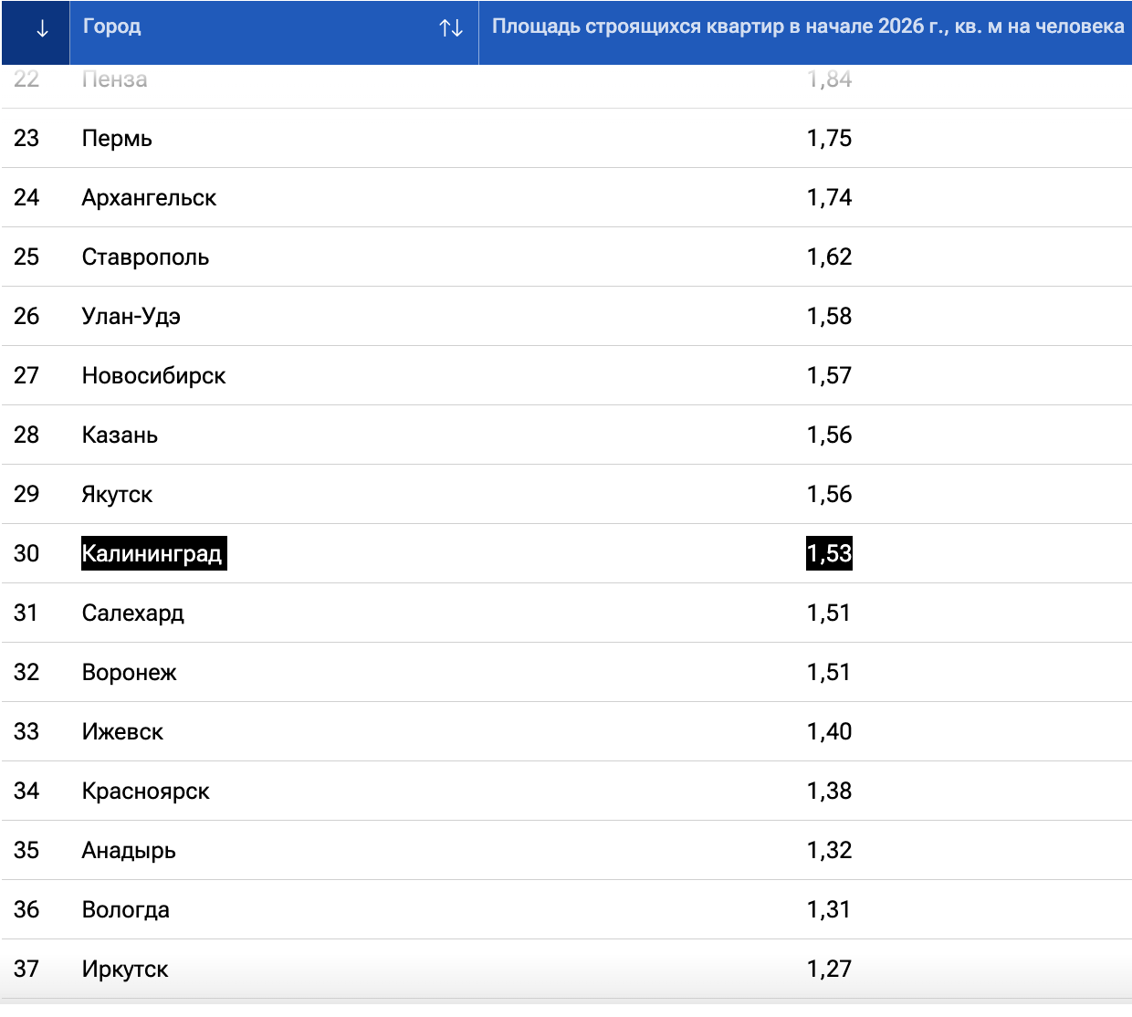 • Площадь строящегося жилья в начале 2026 года в многоквартирных домах на душу населения рассчитана на основе статистики Единой информационной системы жилищного строительства ДОМ.РФ и официальной статистики численности жителей муниципальных образований на начало 2024 года. В рейтинг включены 100 городов — административные центры субъектов РФ, а также другие крупнейшие города России.