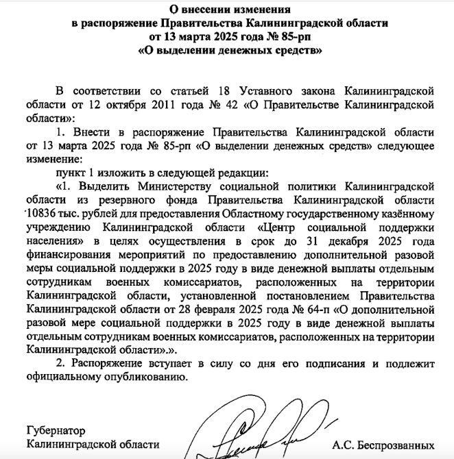 Денежные выплаты получают отдельные сотрудники военных комиссариатов, расположенных на территории Калининградской области, а также сотрудники пункта отбора на военную службу по контракту (I разряда) в Калининграде. Распорядителем бюджетных средств выступает министерство социальной политики облправительства.