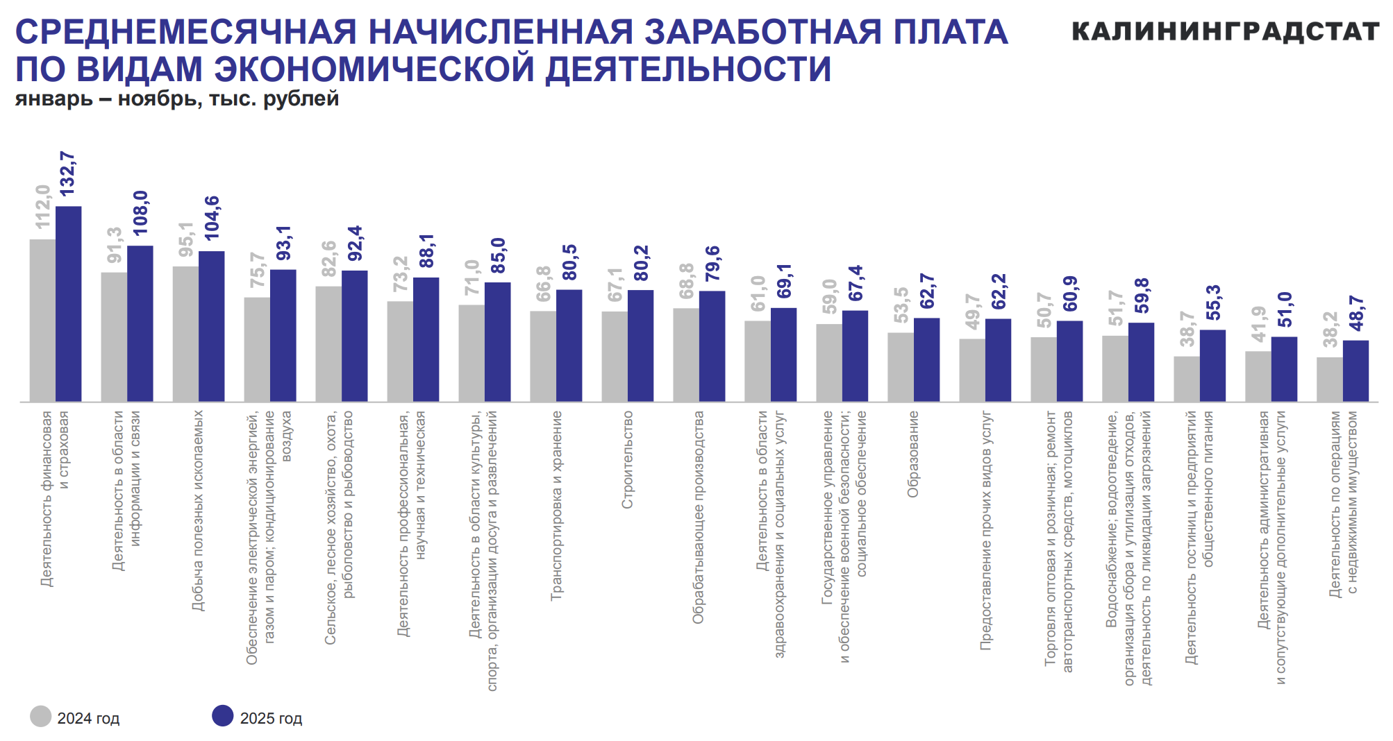 Самую высокую зарплату в Калининградской области получают представители финансовой и страховой сфер: в январе — ноябре 2025 года их заработок составил 132,7 тыс. руб., что на 77,7 % выше средней оплаты труда по региону. Об этом свидетельствуют данные Калининградстата.