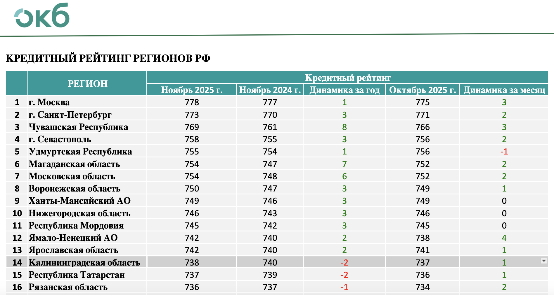 Калининградская область заняла 14 место в рейтинге заемщиков после 17-го места по итогам октября и 19-го в сентябре.