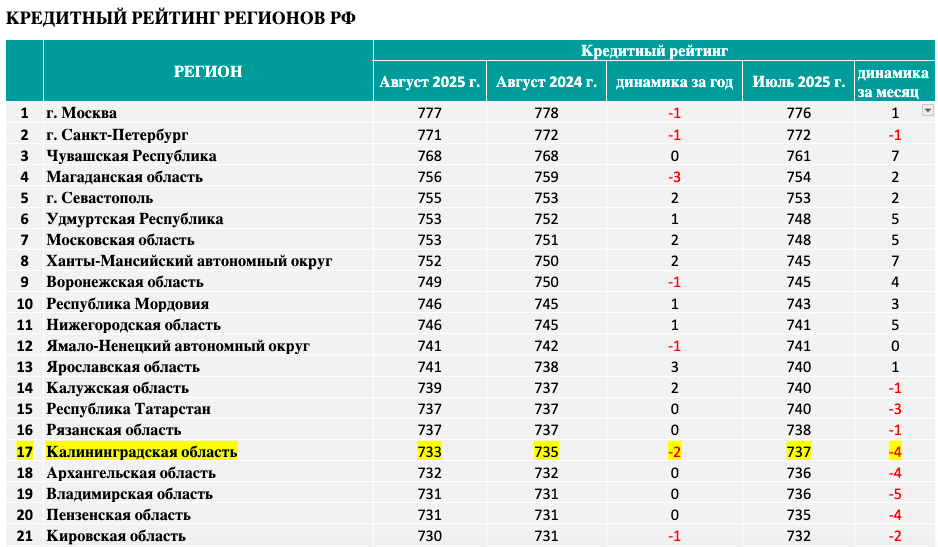 Средний кредитный рейтинг заемщика Калининградской области на август 2025 года составил 733 балла, что на 4 пункта ниже показателя предыдущего месяца (737) и на 2 пункта — в аналогичном периоде 2024 года (735). Соответствующие данные приводит Объединенное кредитное бюро.