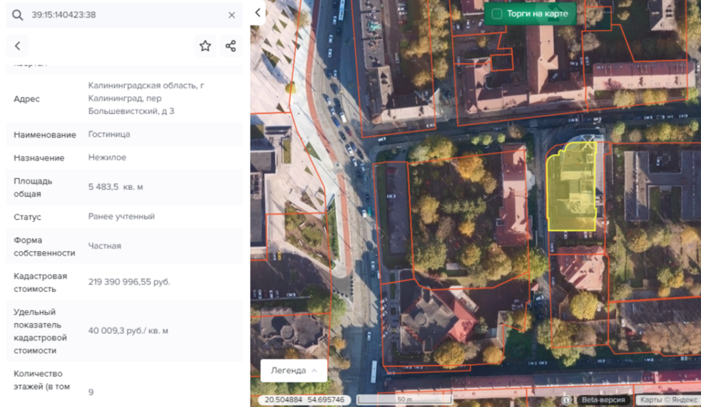 Меньший по площади отель Marton Olympiс на Московском проспекте, 175 занимает участок 39:15:132804:267 площадью 1,29 тыс. кв. м и назначением под «гостиничное обслуживание». Нежилое 4-этажное здание имеет кадастровый номер 39:15:132804:130 и площадь 975,1 кв. м. Общая кадастровая стоимость объекта достигает 39 млн руб.