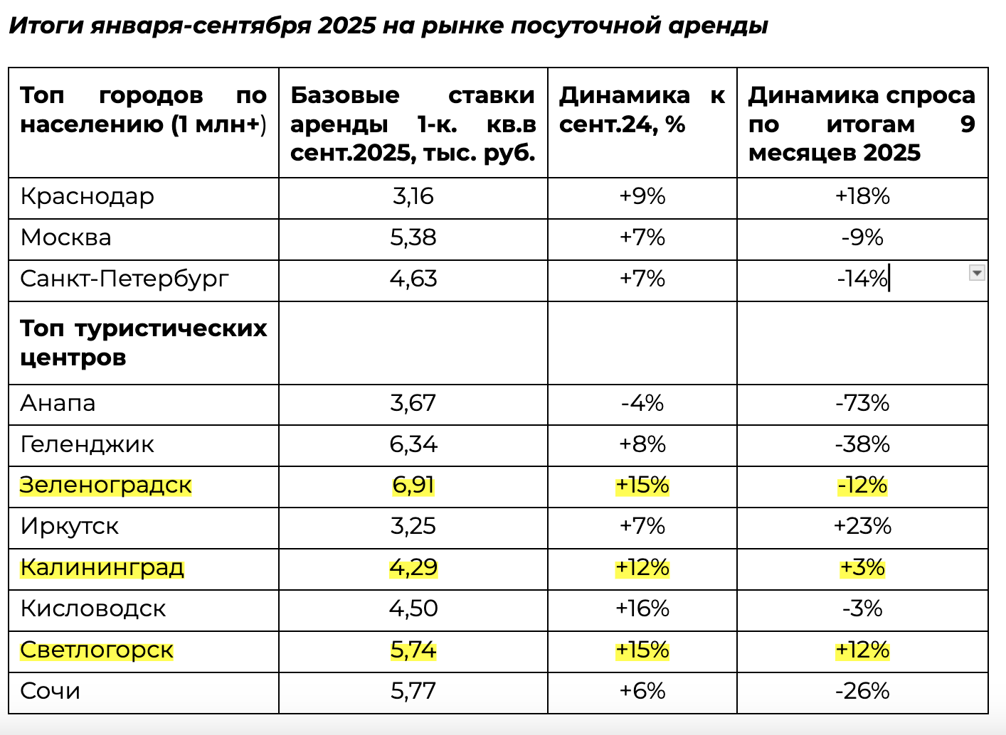 Зеленоградск по стоимости арендной ставки оказался лидером в числе самых популярных в РФ турцентров, Светлогорск — на 5 месте, Калининград — на 7-м. По динамике роста цен год к году Зеленоградск с показателем в 15 % уступает лишь Ялте (+35 %), Севастополю (+28 %) и Кисловодску (+16 %).