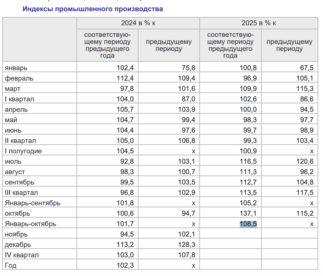 По итогам девяти месяцев, по данным официальной статистики, рост промышленности в регионе составил 5,2 %. Индекс промпроизводства в октябре 2025 года по сравнению с октябрем 2024 года составил 137,1 %, по сравнению с сентябрем 2025 года — 115,2 %. Последний раз месячный показатель снижался в августе — 3,8 % по сравнению с июлем.