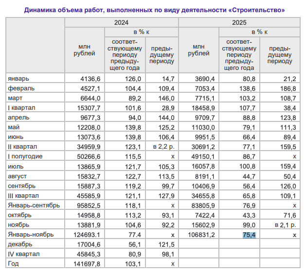 В ноябре прошлого года показатель составил 15,6 млн руб. Это в 2,1 раза выше октября, когда строительные работы составили 7,4 млрд руб. (на 56,7 % меньше октября прошлого года).
