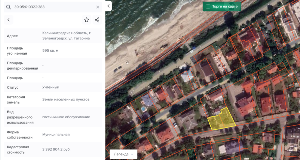 Речь идет об участке 39:05:010322:383 с кадастровой стоимостью 3,39 млн руб. и площадью 595 кв. м с назначением под «гостиничное обслуживание». По факту это бывший огород с теплицей и садом жителей соседнего дома на ул. Гагарина, 31а. Участок был отмежеван только 7 февраля 2024 года непосредственно на границе с территорией отеля «Топаз» на ул. Ленина, 36.Буквально в марте 2025 года администрация Зеленоградска разыграла право аренды указанного участка на ул. Ленина рядом с отелем «Топаз». В жесткой конкуренции Евгений Откосов предложил платить 20,26 млн руб. в год, что в 5 раз выше стартовой цены.