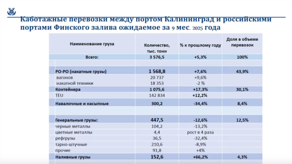 Согласно статистике Росморпорта, основную долю в морских перевозках занимают накатные грузы (вагоны и накатная техника). В общей структуре морских перевозок это порядка 43,9 %. Рост за 9 месяцев 2025 года такого типа перевозок составил 7,6 %. При этом, если перевозка ж/д вагонов демонстрирует тенденцию к увеличению (9,6 %), то, согласно статистике Росморпорта, морская перевозка накатной техники снизилась на 2 %. Это может быть связано с тем, что в июне линию покинул паром «Антей». В сентябре с линии ушел теплоход «Патриа»: как и в случае с «Антеем», мощности судна позволяли перевозить накатную технику.