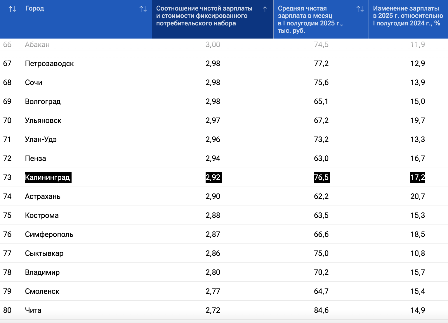 Калининградская область за год опустилась на 70 место в рейтинге по доходам населения. Соотношение чистой медианной зарплаты к стоимости фиксированного потребительского набора в регионе выросло до 2. В среднем по РФ этот показатель достиг 2,6. В Калининградской области чистая медианная зарплата за год выросла с 44,7 тыс. руб. до 54,3 тыс. руб.