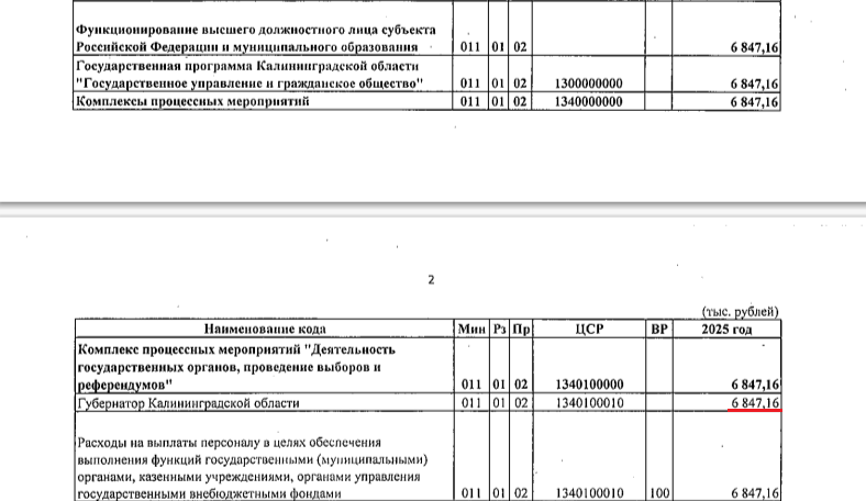 Из областного бюджета на функционирование высшего должностного лица (губернатора) Калининградской области в 2025 году будет выделено в общей сложности 6,847 млн руб. Соответствующая статья расходов предусмотрена в проекте закона о внесении поправок в бюджет, который губернатор Алексей Беспрозванных внес в Законодательное собрание.