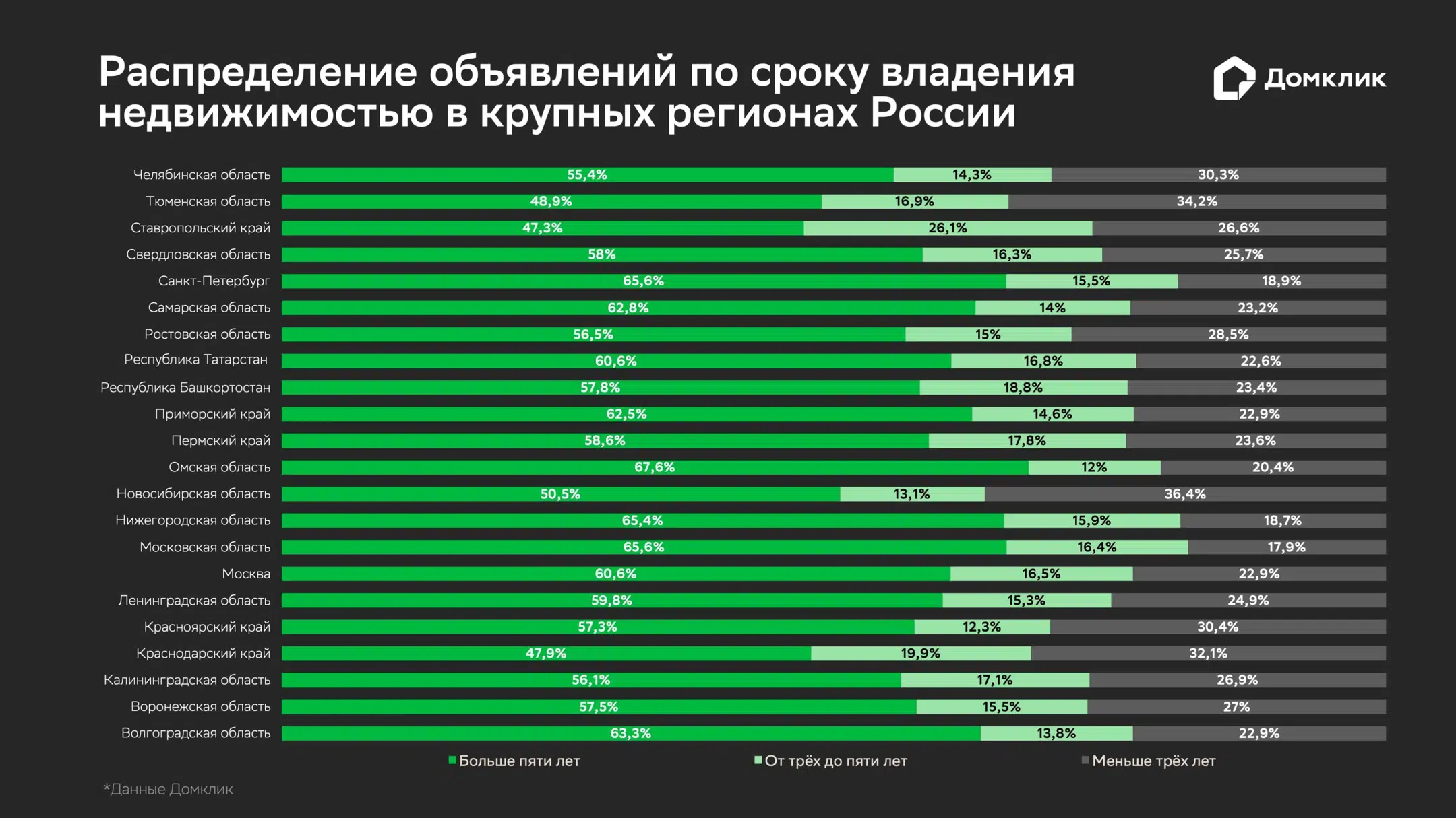 Максимальное количество объявлений о продаже жилья, находящегося в собственности более 5 лет, зафиксировано в Омской области (67,6 %), минимальное — в Краснодарском крае (47,9 %). Наибольшая доля объявлений в сегменте, где продавец недвижимости владеет ею менее 3 лет, — в Новосибирской области (36,4 %), наименьшая — в Московской области (17,9 %).