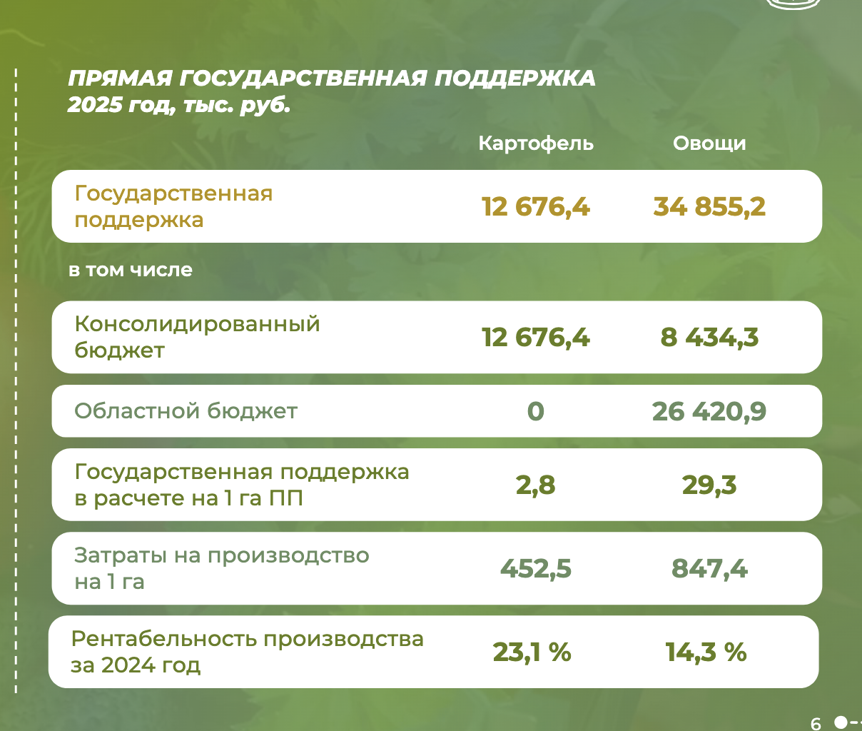 В 2025 году финансирование из федерального бюджета распространяется на посевную площадь, объем посевной продукции и объем использованных элитных семян. Общий объем средств на картофель по господдержке составил порядка 12,7 млн руб., или 2,8 тыс. руб. на гектар.