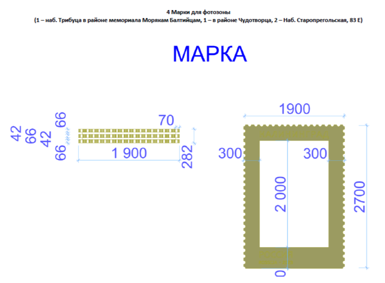 Самый крупный контракт был заключен с ИП Соболевой на поставку 4 малых архитектурных форм в виде почтовых марок за 8,9 млн руб. Речь шла об установке прямоугольных форм, напоминающих по форме фоторамки и марки с надписью «Калининград» и «Россия». Арт-объекты планировалось установить в районе мемориала морякам-балтийцам, возле памятного знака пионерам океанического лова и на Старопрегольской набережной.