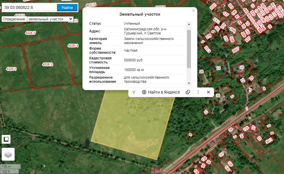 Речь идет об участке 39:03:080822:8 площадью 18 га за железнодорожной станцией в поселке Светлое Гурьевского района. Массив предназначается для «сельхозиспользования». Кадастровая стоимость земли составляет всего 588,6 тыс. руб.