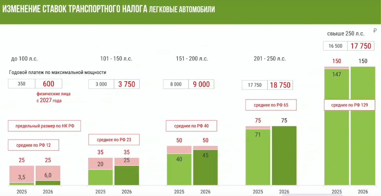 Транспортный налог уже повышали с начала 2025 года — с 2,5 до 3,5 руб. за одну л.с. для автомобилей с мощностью двигателя до 100 л.с. и т. д., указанное повышение стало первым с 2025 года. В том же законе предусмотрели «стимулирование спроса на электромобили», освободив владельцев машин до 272 л.с. (200 кВт) от уплаты транспортного налога до 2027 года.