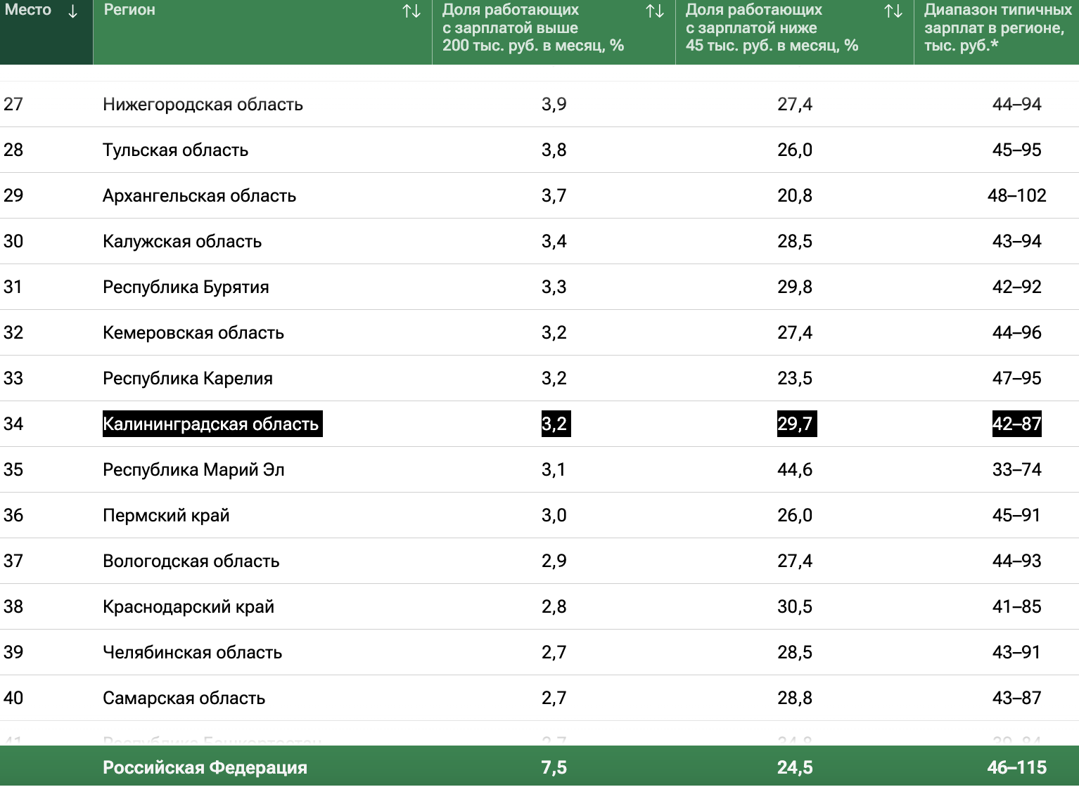 Доля работающих в регионе с зарплатой более 200 тыс. руб. в месяц составила 3,2 %. Менее 45 тыс. руб. получают 29,7 % работников. Наиболее распространенные зарплаты в Калининградской области — от 42 до 87 тыс. руб. (от 31 до 64 тыс. руб. годом ранее).