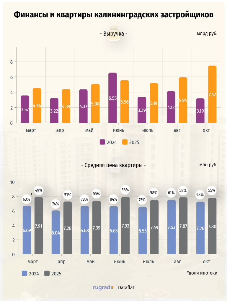 Доходы калининградских строителей жилья и апартаментов в октябре оказались почти наполовину больше, чем фиксировалось по итогам первого весеннего месяца, — 7,47 млрд руб. против 4,54 млрд руб. По сравнению с августом показатель увеличился на 25,7 %, свидетельствуя в том числе об успешном турсезоне и итоговых покупках квартир приезжими и инвесторами (сентябрьские показатели Dataflat не приводит).