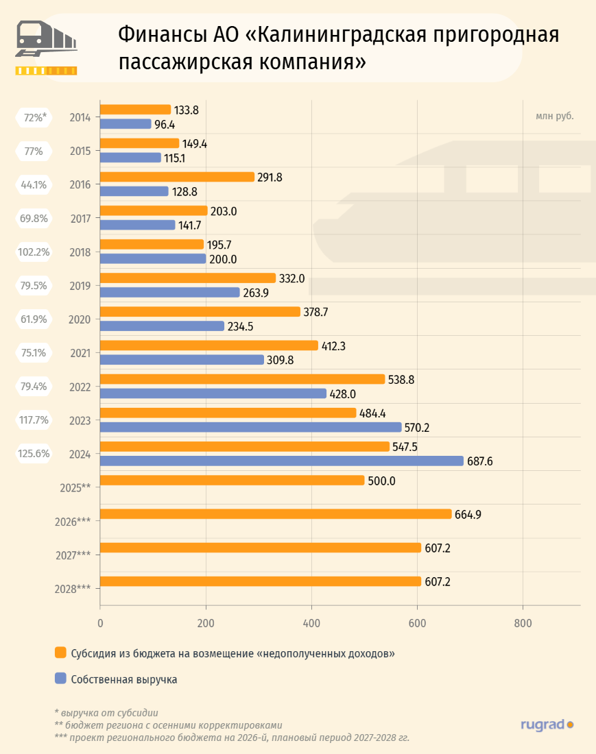 В 2024 году объем бюджетной поддержки достиг 547,5 млн руб., тогда как собственная выручка компании выросла до 687,6 млн руб., превысив субсидии более чем на 25 %. До 2023 года правительство области финансировало дочернюю структуру КЖД в объемах, превышающих собственные доходы компании-перевозчика.