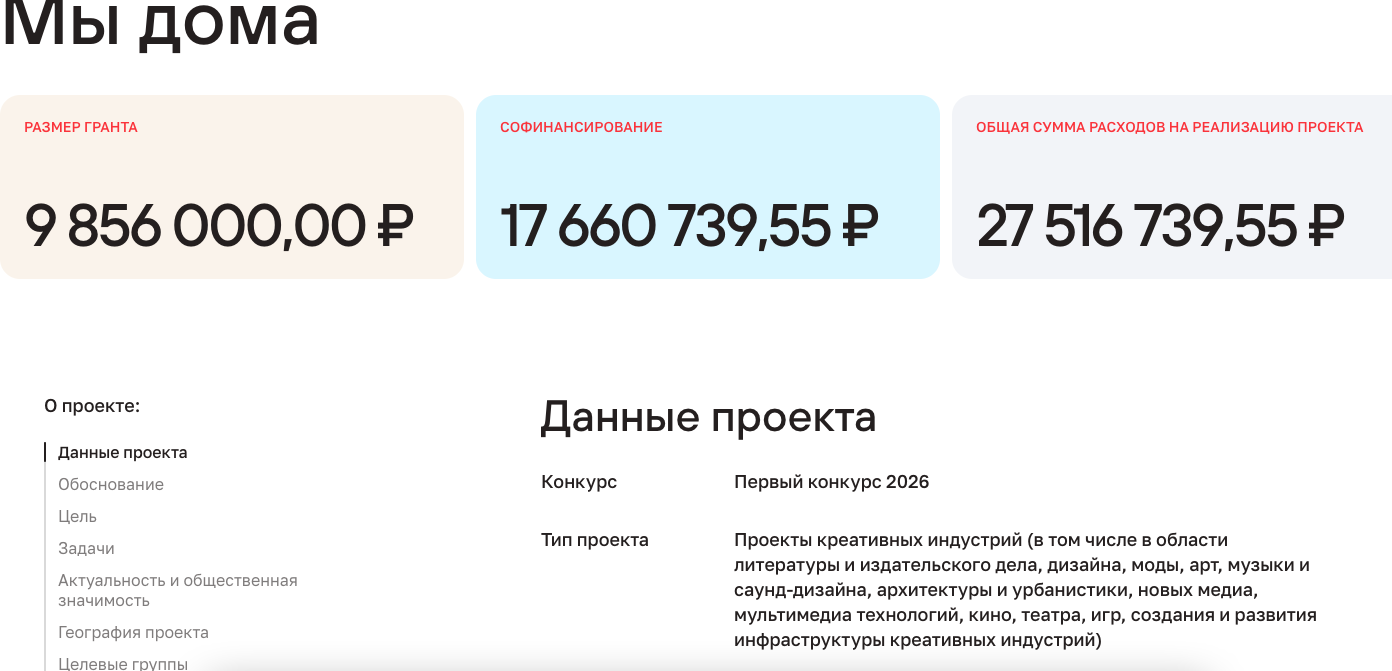 Правительственному фонду «Креспектива» снова не удалось получить грантовое финансирование от Президентского фонда культурных инициатив. «Креспектива» рассчитывала получить порядка 9,8 млн руб. на проект международного форума креативных индустрий «Мы дома». В частности, речь шла о популяризации и формировании геобрендинга территории. Мероприятия форума, как следует из заявки, планировали проводить в Калининграде и Янтарном. По итогам мероприятия должен был выйти цифровой журнал «Мы дома».