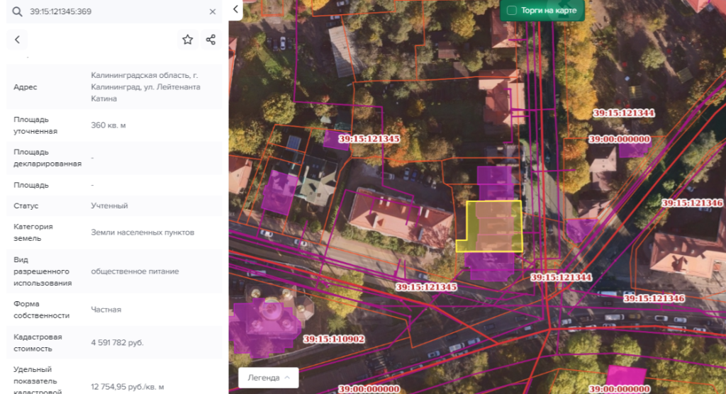 Отмечается, что под реконструкцию в кафе попали 3-этажные блокированные дома под литерами «б», «в», «г». Как указано в ЕГРН, здания с кадастровыми номерами с 39:15:121345:357 по 39:15:121345:359 все еще официально являются жилыми. Однако вид разрешенного использования участка под ними площадью 360 кв. м уже изменен на «общественное питание».