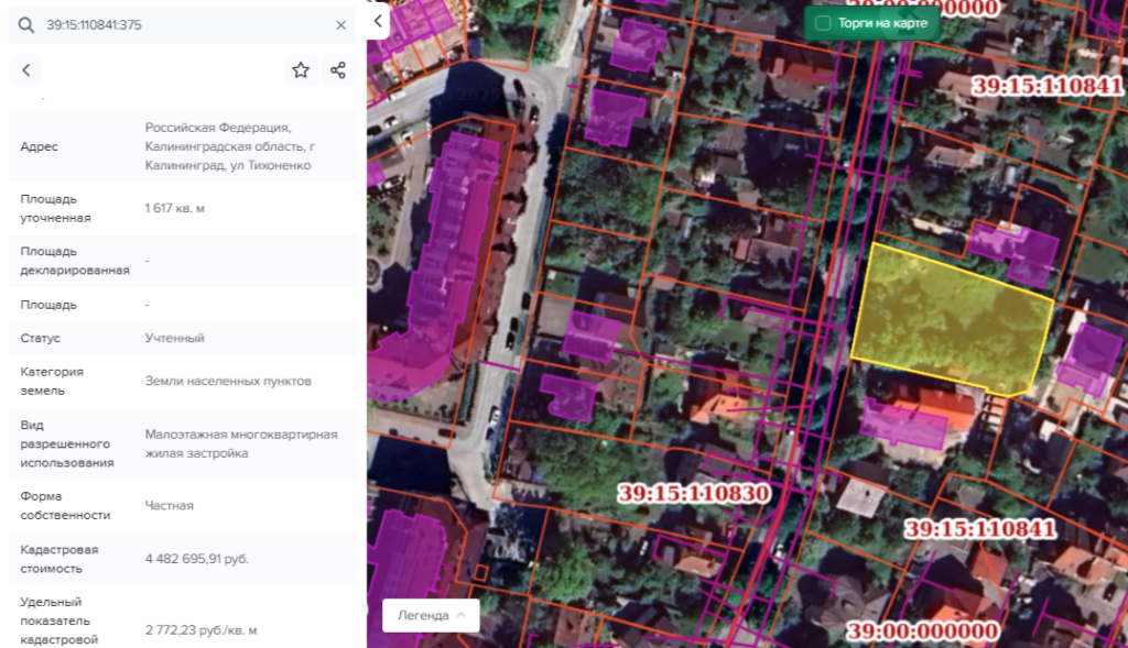 Отметим, что ранее массив имел кадастровый номер 39:15:110841:26 и ту же площадь 16 соток. Однако 5 августа земля была перекадастрирована и зарегистрирована с новым номером 39:15:110841:375. Ее кадастровая стоимость снизилась с 5,4 млн руб. до 4,5 млн руб. при сохранении вида разрешенного использования под «малоэтажное многоквартирное строительство». При этом на массив уже оформлена ипотека.