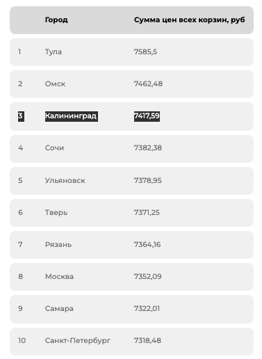 Калининград по стоимости типовой аптечной корзины занял третье место среди крупных городов. Дороже аптечная корзина оказалась только в Туле (7 585 руб.) и Омске (7 462 руб.). Самые доступные лекарства — в Казани (7 039 руб.), Новосибирске (7 101 руб.) и Архангельске (7 117 руб.). В целом по стране средняя стоимость корзины за месяц выросла на 0,79 %.