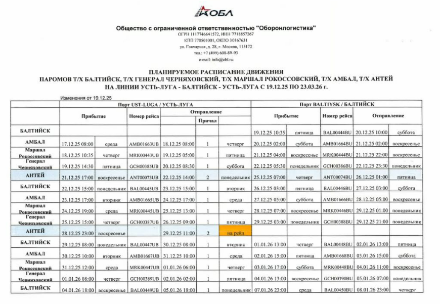 Таким образом, в январе 2026 года «Антей» сможет выполнить только 3 кругорейса между Усть-Лугой и Балтийском. При этом ближайший билет в новом году на провоз седельного тягача с полуприцепом есть в открытой продаже только на рейс 22-23 января из Балтийска в Усть-Лугу. В феврале запланированы стандартные 4 кругорейса.