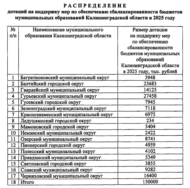 Наименьший размер дотации предусмотрен для Ладушкина — 234 тыс. руб. Относительно небольшую поддержку получат также Неманский (2,4 млн руб.) и Правдинский муниципальные округа (5,3 млн руб.).