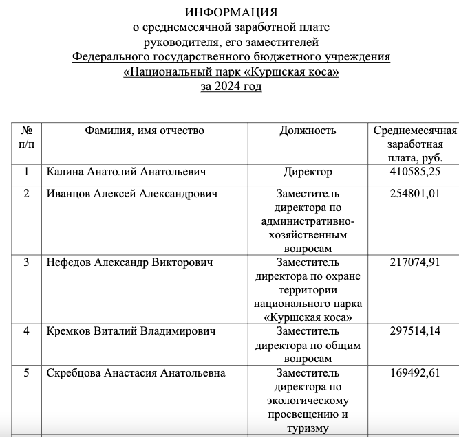 о заработной плате в нацпарке, среднемесячная заработная плата Анатолия Калины как директора ФГБУ составляла 410,5 тыс. руб. в месяц. Зарплата Иванцова оценивалась в 254,8 тыс. руб. в месяц.