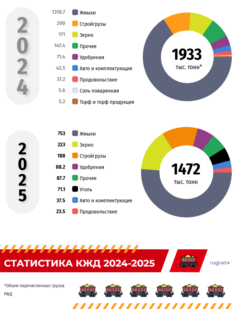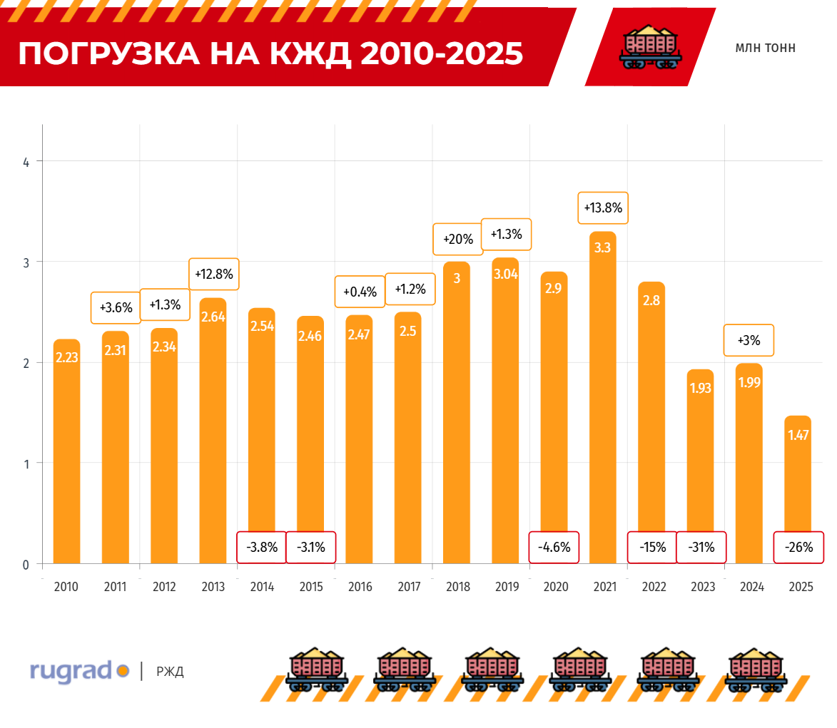 За 2025 год погрузка на «Калининградской железной дороге» продемонстрировала падение практически на четверть — на 26 %. Показатель составил порядка 1,47 млн тонн грузов. Хотя за 2024 год было обработано 1,99 млн тонн.