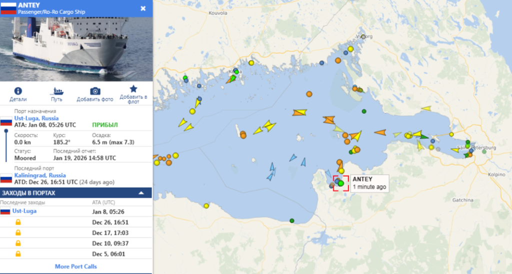 Согласно расписанию паромного сообщения, «Антей» не совершал рейсы по калининградскому направлению в период новогодних каникул. В настоящее время паром находится в порту Усть-Луги. После 8 января судно не покидало гавань.