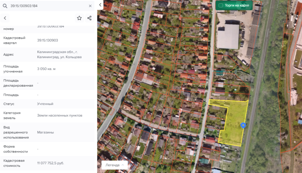 Администрация Калининграда отмежевала участок 39:15:130903:184 площадью 3,05 тыс. кв. м буквально в июле 2025 года. Несмотря на расположение за малоэтажной жилой застройкой и ИЖД для него был выбран вид разрешенного использования под «магазины». Фактически заезд на участок с торговой функцией образован за счет бывших огородов соседних частных домов. При этом некоторые из них довольно ветхие, деревянные и, вероятно, не используются для постоянного проживания. Сама территория под будущие магазины так же представляет из себя бывшие сады и огороды между железнодорожной линией и частными домами на ул. Кольцова, которые тем не менее не входили в границы официальных участков под ИЖД.