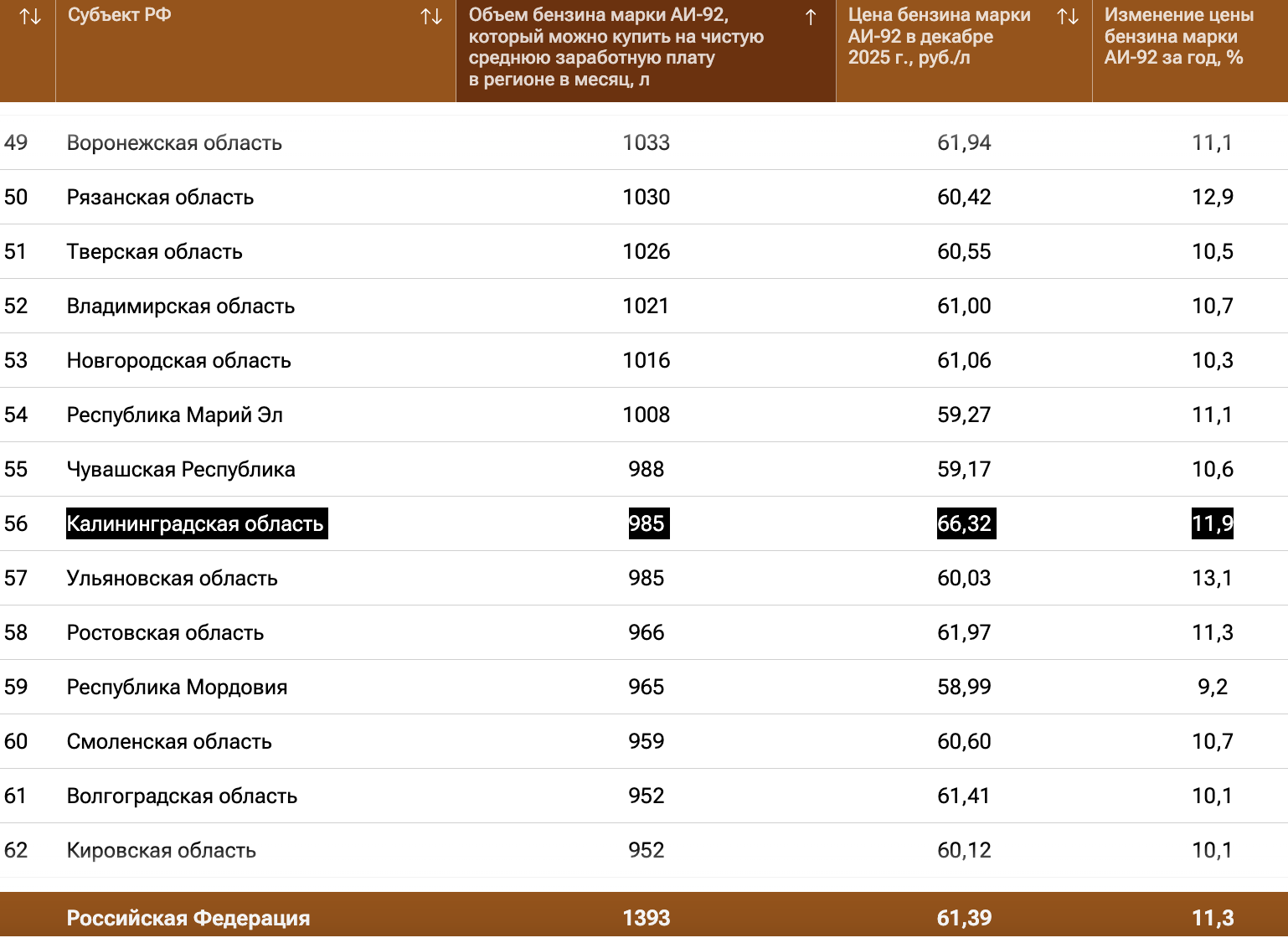 По состоянию на апрель 2025 года Калининградская область заняла 60 место по доступности бензина. В регионе на среднюю месячную зарплату можно было купить 965 литров топлива марки АИ-92.