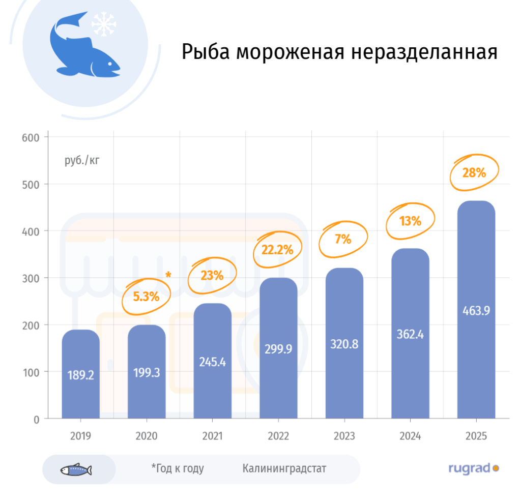 Согласно данным Калининградстата, в декабре 2025 года цена замороженной рыбы в розничной торговле составляла порядка 463 руб. за килограмм. За год рыба подорожала примерно на 28 %. В декабре 2024 года ее цена составляла 362 руб. за килограмм.