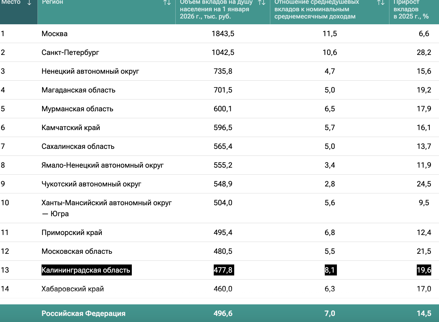 На начало 2026 года «объем вкладов на душу населения» в регионе составил 477,8 тыс. руб. (399 тыс. руб. годом ранее). Отношение среднедушевых вкладов к номинальным среднемесячным доходам достигло 8,1 (8,2), а в прошлом году банковские вклады калининградцев выросли на 19,6 % (25,2 % в 2024 году).