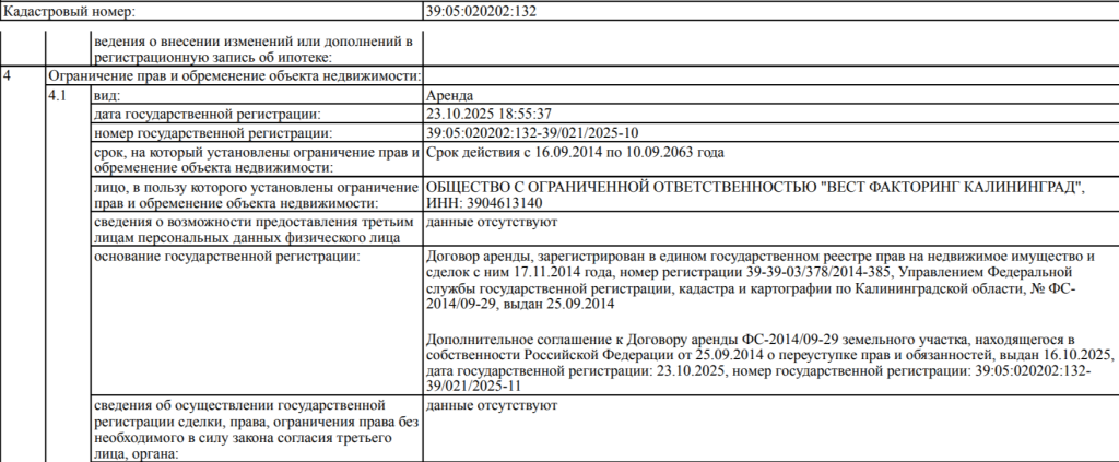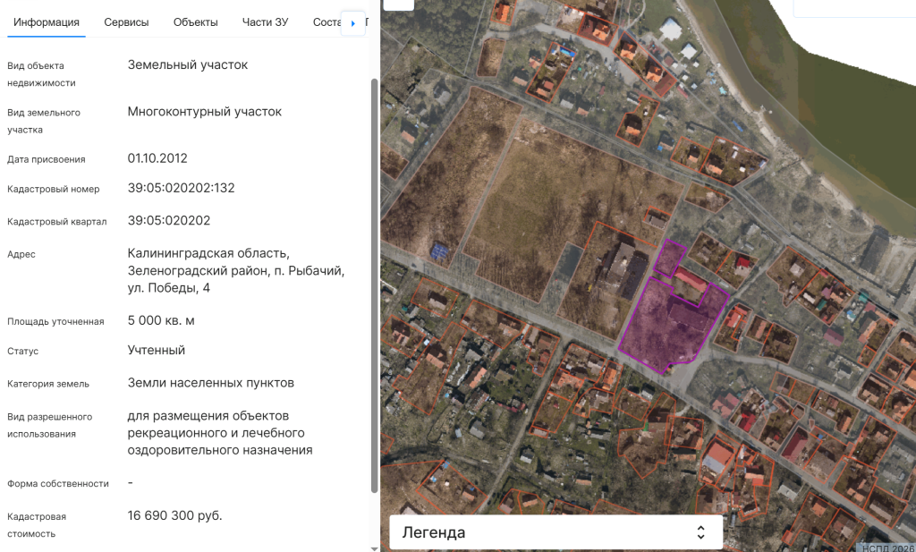 По данным RUGRAD, речь идет об участке 39:05:020202:132 площадью 0,5 га и кадастровой стоимостью 16,7 млн руб. на ул. Победы, 4 в самом центре Рыбачьего. Вырубка прошла еще в начале декабря 2025 года. Массив предназначается «для размещения объектов рекреационного и лечебного оздоровительного назначения». Ранее он находился в распоряжении рыбколхоза «Труженик моря». Но 23 октября 2025 года право долгосрочной аренды было выкуплено компанией «Вест Факторинг Калининград», которая может распоряжаться землей до 2063 года. При этом актив остается в федеральной собственности.