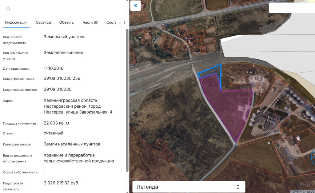 Речь идет об освоении участка в юго-восточной части Нестерова на ул. Завокзальной, 4. По этому адресу с 2018 года размежеван массив с кадастровым номером 39:08:010030:259 площадью 2,2 га с разрешенным использованием под «хранение и переработку сельскохозяйственной продукции». Кроме того, на соседнем массиве находится рапсовый завод «ДолговГрупп» в Нестерове. По этому же адресу зарегистрирован ряд структур агрохолдинга.
