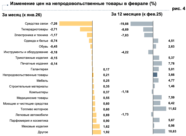 В феврале, напротив, подешевели средства связи, телерадиотовары, электроника и техника благодаря акциям крупных сетевых магазинов и укреплению рубля. В целом за год средства связи подешевели на 19,8 %, телерадиотовары — на 8,7 %, а электроника и техника — на 7,8 %.
