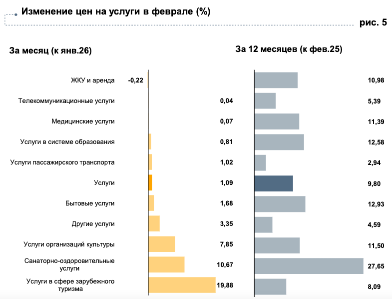 Если говорить об услугах, то в феврале заметно подорожал зарубежный туризмана фоне роста спроса на поездки за границу в период высокого сезона в ряде стран дальнего зарубежья, при этом цены на такие туры традиционно меняются часто и существенно. За год услуги зарубежного туризма подорожали на 8,09 %.