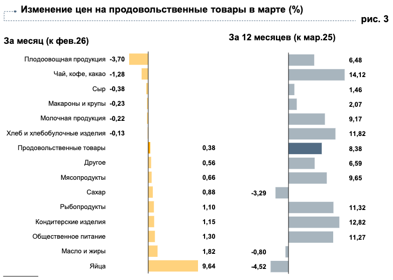 «Больше остальных подорожали яйца: несмотря на рост производства и длительное удержание цен на уровне себестоимости, в марте производители повысили цены для компенсации издержек, при этом в целом за год куриные яйца подешевели на 4,5 %. Также выросли цены на масло и жиры, в том числе сливочное масло, поскольку региональные производители закладывали в стоимость продукции увеличение расходов на сырье, обслуживание оборудования и логистику.